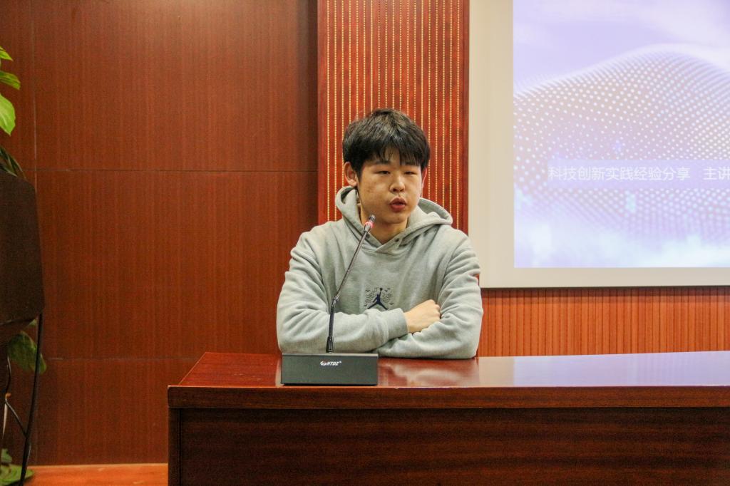 在分享会上,张卿尧首先以自身备战科技竞赛的经历为切入点,重点拆解了机器人作品的制作全过程。他系统拆解了机器人作品从创意构思到落地成型的全流程。他结合赛事规则细节,深入讲解了机器人功能定位的精准锚定方法,逐一拆解机械结构设计的核心要点、硬件选型的实操技巧、程序编写的逻辑框架及系统联调的关键步骤,并分享了可直接参考的参赛流程规划与时间管理方案。针对电控环节的常见痛点,他特别强调,机器人行走偏航、赛道越界等问题的核心解决方案在于电控系统的精细化调试,同时需同步强化机械结构的稳定性设计,通过“软硬件协同优化”提升作品竞争力。此外,张卿尧还结合自身学习经历,分享了如何高效利用课余碎片化时间夯实专业基础,着重强调了高等数学、工程力学、编程基础等核心课程对科创实践的重要支撑作用,鼓励同学们以坚韧不拔的心态直面科创道路上的挫折与挑战,在实践中积累经验、锤炼本领。
